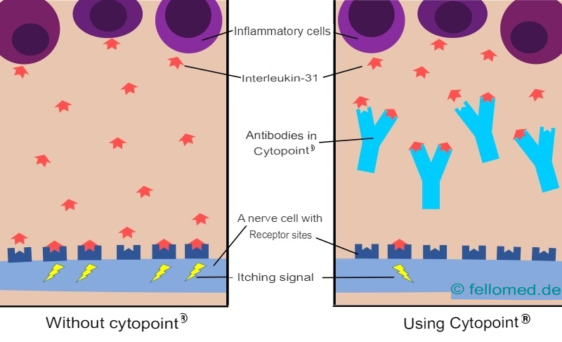 If a dog is treated with Cytopoint, the antibodies it contains combine with IL-31 and intercept the messenger substance before it can dock onto the nerve cells. This interrupts the itch signal and the dog stops scratching.